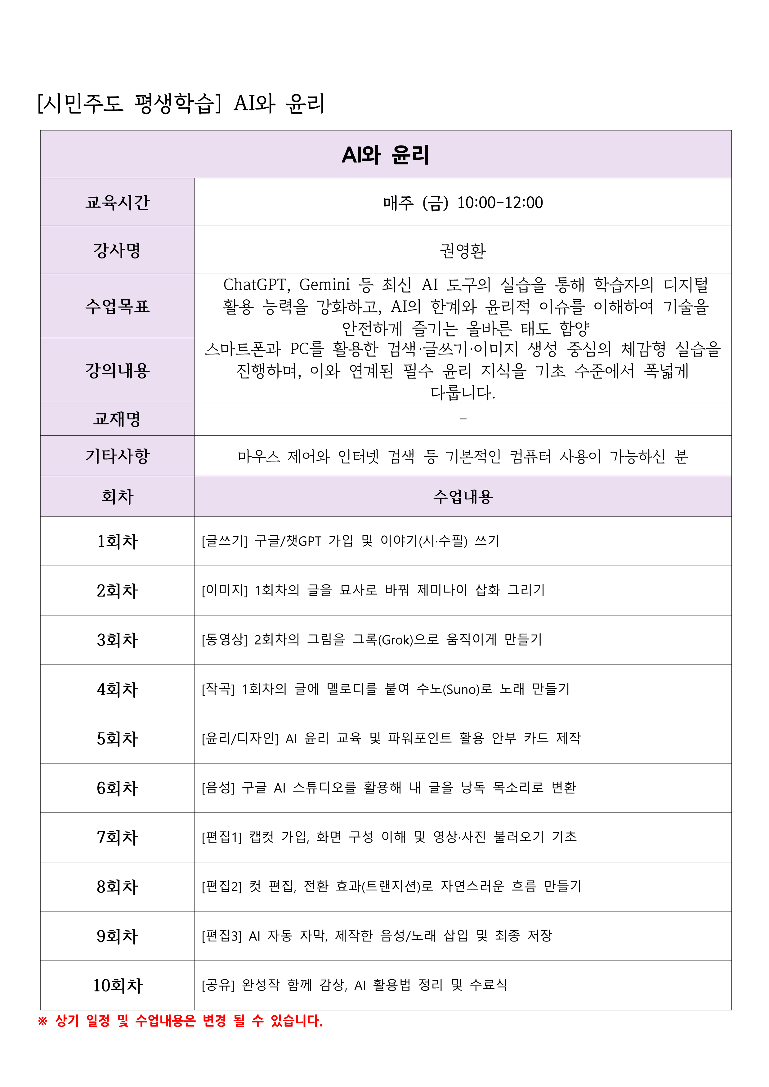 ○수업목표: ChatGPT, Gemini 등 최신 AI 도구의 실습을 통해 학습자의 디지털 활용 능력을 강화하고, AI의 한계와 윤리적 이슈를 이해하여 기술을 안전하게 즐기는 올바른 태도 함양 ○강의 내용: 스마트폰과 PC를 활용한 검색·글쓰기·이미지 생성 중심의 체감형 실습을 진행하며, 이와 연계된 필수 윤리 지식을 기초 수준에서 폭넓게 다룹니다. ○기타 사항: 마우스 제어와 인터넷 검색 등 기본적인 컴퓨터 사용이 가능하신 분 ☆ 하단의 『강의계획서』를 꼭 참고해 주세요!