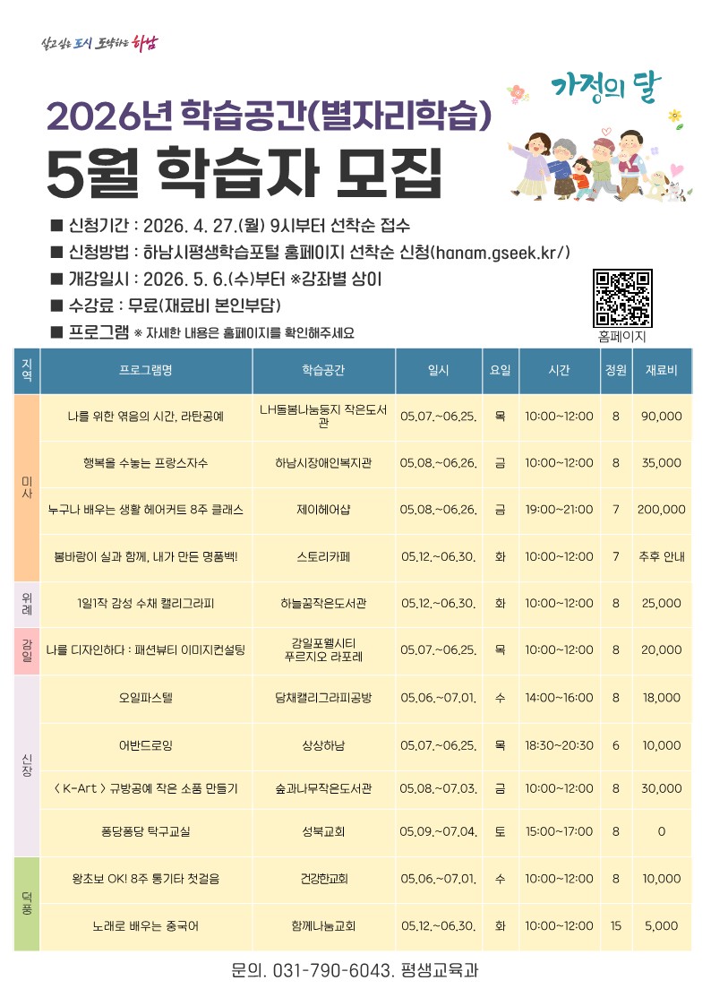 ○접수방법: 온라인 접수 (하남시평생학습포털-오프라인학습)
