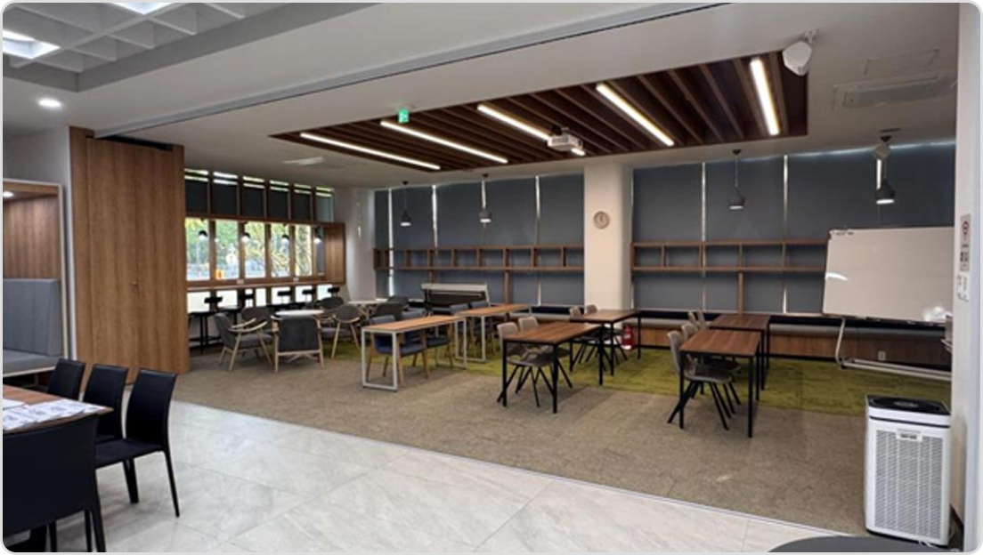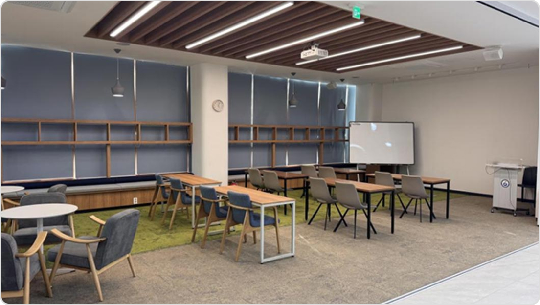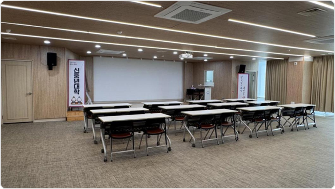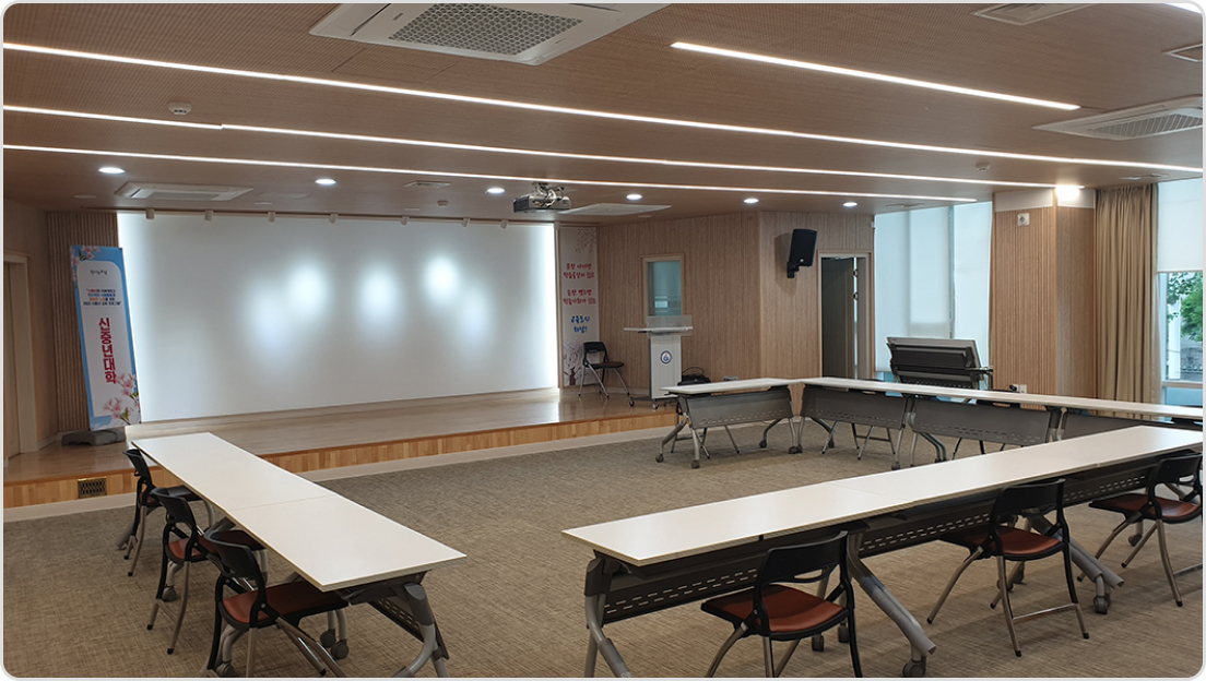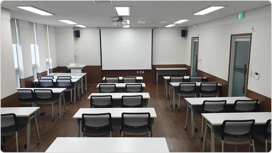 빔프로젝터, 영사용스크린, 노트북, 칠판(화이트보드), 마이크, 스피커, 책상, 의자