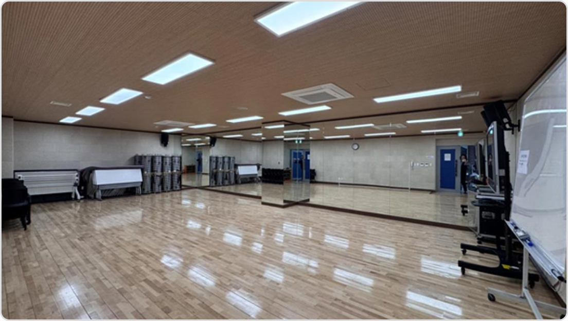 전면 거울, 마이크, 스피커, 칠판(화이트보드) 책상, 의자 등